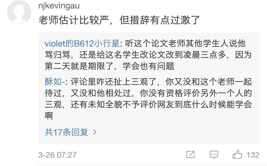 但也有不少网友认为学生不争气,虽然爆粗口不对,但理解导师发火是“情有可原”,如果惩罚太重,会影响科研和学生发展,这样对学生损失更大。有网友指出,虽然微信上比较暴躁,该论文导师还是给被骂学生改论文改到了第二天下午三点截稿,但其本人并不妖魔。