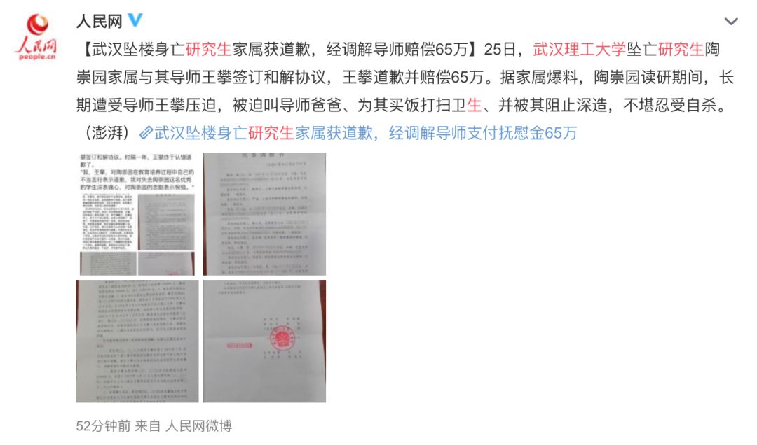 今天早上,一年前的“武汉理工大学自动化学院研究生陶崇园自杀”事件有了新进展,陶崇园姐姐发博称,涉事导师王攀对其在陶崇园教育培养过程中自己的不当言行表示道歉,并赔偿 65 万。去年,3 月,据家属爆料,陶崇园长期遭受导师王攀压迫,不堪忍受后选择自杀,曾被迫叫导师爸爸。