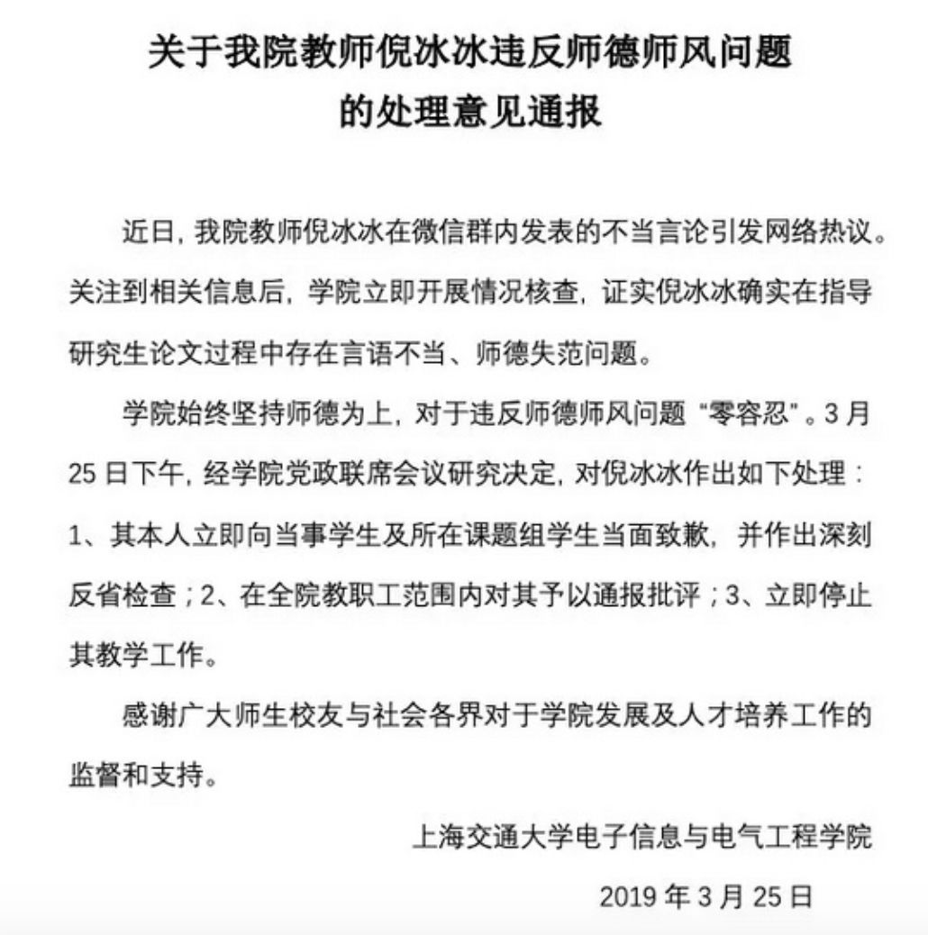 事件爆料后,这一迅速在微博、知乎等渠道传开,引发网友热议。3 月 25 日晚,上海交通大学电子工程系在其官方微信发布关于该院教师倪冰冰违反师德师风问题的处理意见通报,通报声明,倪冰冰确实在指导研究生论文过程中存在言语不当、师德失范问题。