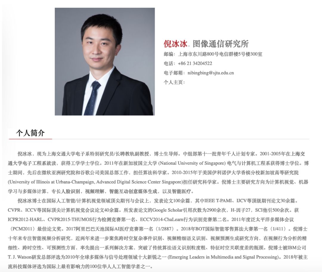 根据上海交通大学电子工程系资料显示,倪某是上海交通大学电子系特别研究员,长聘教轨副教授,博士生导师。倪博士主要研究方向为计算机视觉、机器学习与多媒体计算,专长人脸识别,视频理解,智能互动创意媒体生成,以及智能医疗。 他在在国际人工智能/计算机视觉领域顶尖期刊与会议上,发表论文 100 余篇,其中 IEEE T-PAMI、IJCV 等顶级期刊论文 30 余篇。CVPR、ICCV 等国际顶尖计算机视觉会议论文 40 余篇。目前,倪某在上海交通大学分别给本科生和研究生上机器学习和计算视觉理论与工程实践两门课程。