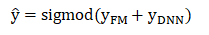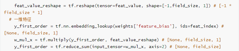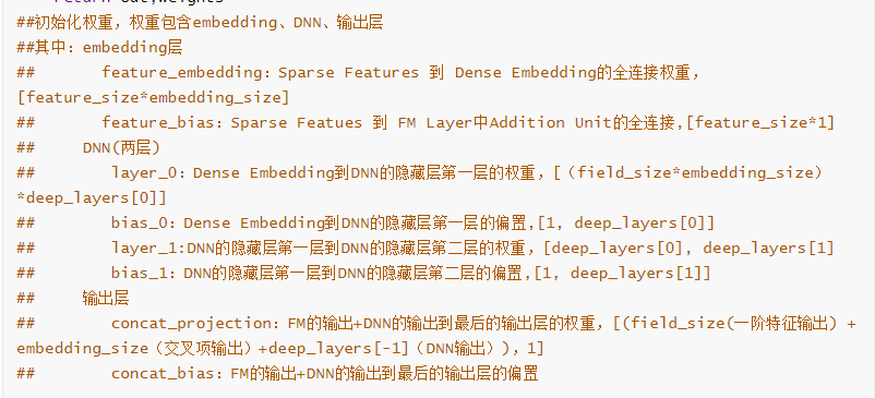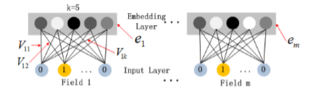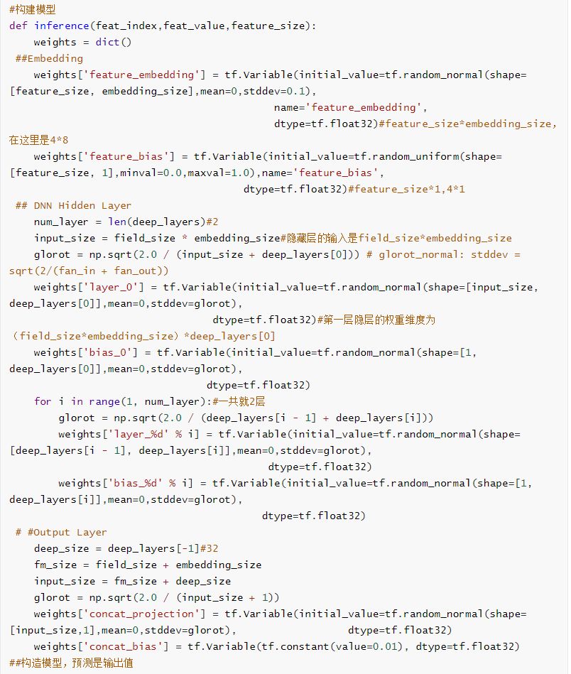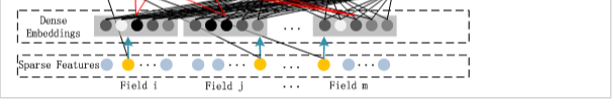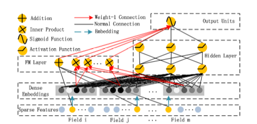 Note: 在FM部分和DNN部分,embedding是共享权重的,对同一个特征来说,得到的V_i 相同。虽然输入fields的长度不同,但是embedding之后的长度是一样的。