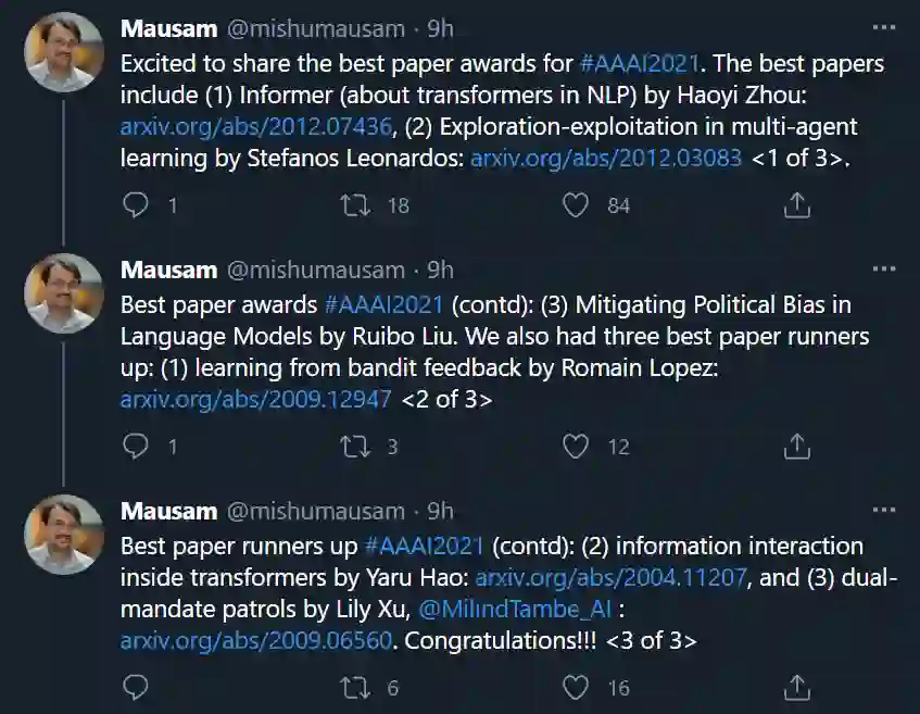 AAAI 2021程序委员会 Cochair Mausam公布论文奖项。