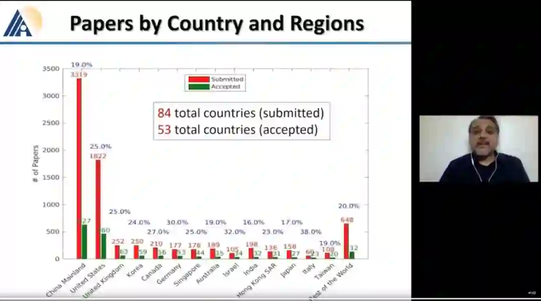 作为全球人工智能顶会之一,虽然受到疫情限制,但 AAAI 2021 的热度仍然不减,本届 9034 篇提交论文的数量又创下了历史新高(去年为 8800 篇)。其中,来自中国的 3319 篇论文数量几乎是美国(1822 篇)的两倍。在最终 7911 篇经过评审的论文中,共有 1692 篇被接收。今年的论文接收率为 21%,略高于去年(20.6%)。