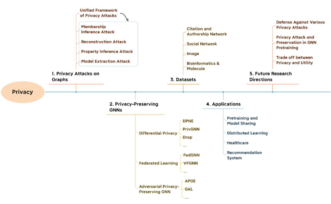 模型训练集中的隐私信息可能会在发布的模型或者提供的服务泄露。然而现有的综述论文多以讨论在图像和文本这类数据的隐私问题,其中讨论的方法难以拓展到图数据结构和采用 message-passing 架构的图神经网络。因此我们对隐私攻击(privacy attacks)以及图神经网络的隐私保护(privacy-preserving GNNs)进行了概述总结。囊括的概念和方法都列在图 1 之中。首先,我们对隐私攻击方法总结出了统一的框架。