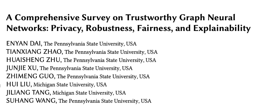 [6] Dai, Enyan, Tianxiang Zhao, Huaisheng Zhu, Junjie Xu, Zhimeng Guo, Hui Liu, Jiliang Tang, and Suhang Wang. "A Comprehensive Survey on Trustworthy Graph Neural Networks: Privacy, Robustness, Fairness, and Explainability." arXiv preprint arXiv:2204.08570 (2022).
