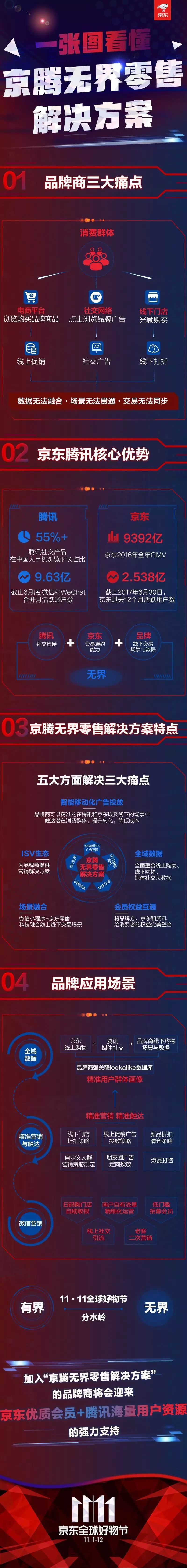 MaryMeeker2016年《互联网趋势》报告显示,腾讯的产品,包括微信、手机QQ、QQ浏览器、腾讯新闻、腾讯视频等,占据中国网民55%+的移动消费时长。根据腾讯Q2财报显示,截止6月底,微信和WeChat的合并月活跃账户数达到9.63亿。根据Questmobile《 移动互联网2017年Q2夏季报告》:微信月度人均在线时长达到1,911分钟。在这个场景当中,还没有任何一平台商或品牌商形成完整的数据闭环。这对于品牌商来说,这也是走向未来零售场景中最大的蓝海所在。而据中国规模最大零售商京东集团财报显示,按照行业标准其2016年全年GMV达到9392亿元;截至2017年6月30日,过去12个月的累积活跃用户达2.583亿。腾讯的连接能力和京东的交易、履约能力,恰恰能帮助品牌商结合线下能力完成走向无界零售的最后一环。据徐雷介绍,这个方案主要包括如下几个方面: