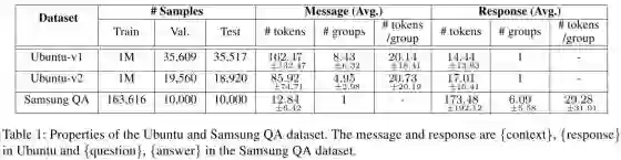 文章中使用了Ubuntu 数据集和从三星官网上爬的数据来验证模型。数据的特点如下所示: