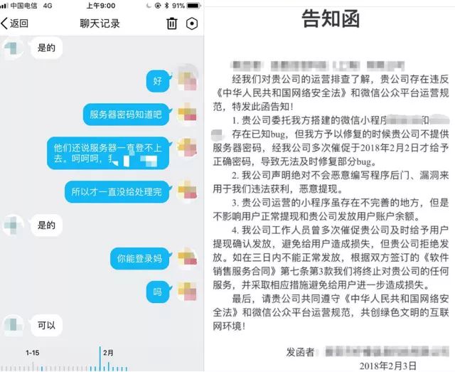 事情越闹越大,Alan和他的小程序声誉扫地,由于投诉过多,微信官方限制了他的商户服务号,“更可气的是,此时服务商出示一纸告知函,倒打一耙,把BUG未能及时修复的锅抛给了我,自己与此事撇清了干系”。