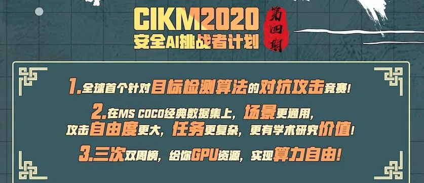 阿里安全和清华大学联合举办,数据挖掘顶会CIKM强力支持的CIKM2020安全AI挑战者计划第四期开赛。在第四期目标检测领域MS COCO经典数据集上,场景更通用,攻击自由度更大,任务更复杂,学术价值更高!