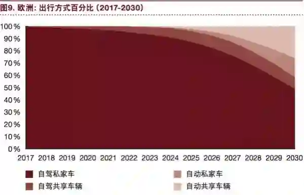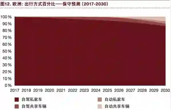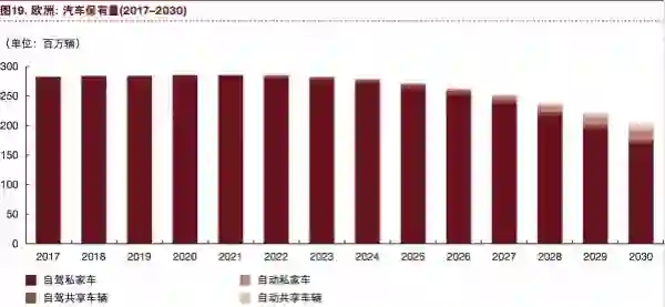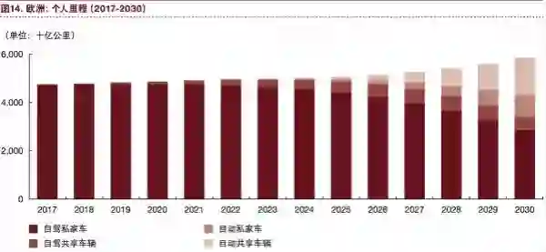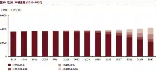 目前欧洲的车辆保有量超过2.8亿辆,几乎全是私人拥有和使用的。向自主共享的出行形式的转型百分比显示,到2030年,保有量可能会降至2亿多辆。与此同时,由于共享自主驾驶的利用率较高,保有量车辆能产生更高的里程,将超过4.2万亿公里。
