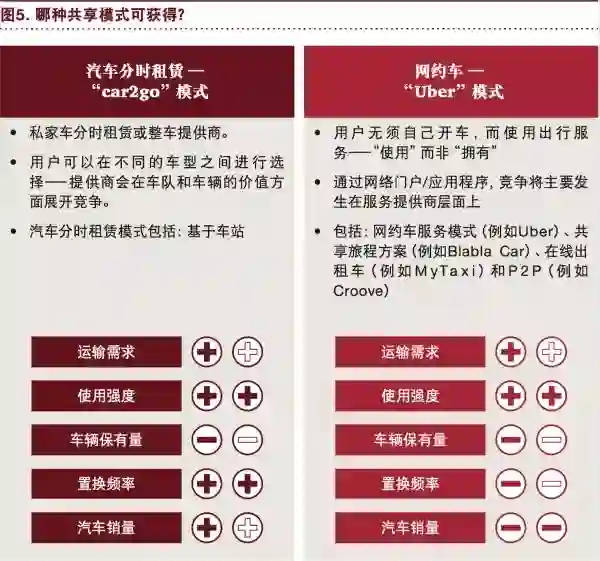 使用而非拥有:行为的变化将定义未来的出行方式。出行选择的广度和深度将显著增加。这一点,已在本部分所述的提供商数量增加中得到了论证。新型创业公司正在与现存的汽车、运输和物流公司争夺市场份额。共享出行方式有以下两种不同的表现形式:分时租赁汽车和网约车。