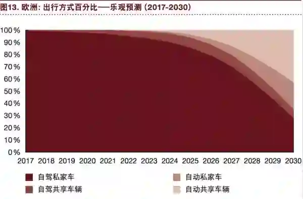 乐观预测:而开放预测则认为未来自主驾驶汽车将保持极高的采用率。在此种情况下,到2030年,所有自主驾驶汽车里程占个人里程的比例将达60%以上。无论是消费者需求,还是法律技术要求,都不会对此种新兴出行方式的发展造成任何障碍。