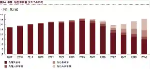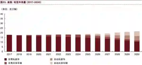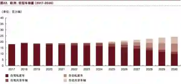 到2030年,轻型汽车的新增销售量可能从如今的1700万,增长至2400多万。最早在2025年,新车销售总量中,可能包括200万辆无人驾驶汽车。到2030年,这一数字将稳步增长,达到近1250万辆。这意味着每两辆新车中就有一辆已经完全自主化,这将完成向「eascy」车辆新常态的过渡。