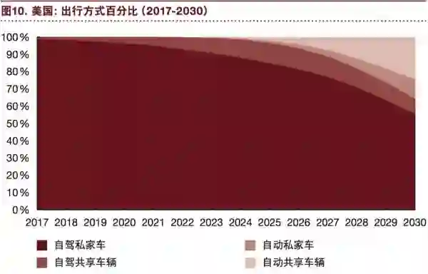 在美国,目前只有1%以上的个人车辆行驶里程采用的是共享形式。2021年此比例可能会超过5%,到2030年可能会高达33.5%。那时,无人驾驶共享汽车的使用比例可接近10%,自主共享汽车的可接近24%。并且,到2030年,美国境内的个人里程中,自主车辆的里程将接近36%。