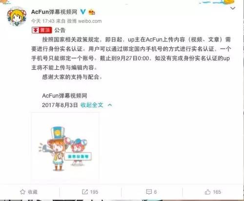 【TechWeb报道】昨日晚间消息,AcFun弹幕视频网今日在官方微博上发布声明称,按照国家相关政策规定,即日起,up主在AcFun上传内容(视频、文章)需要进行身份实名认证。截止到9月27日0:00,如没有完成身份实名认证的up主将不能上传与编辑内容。