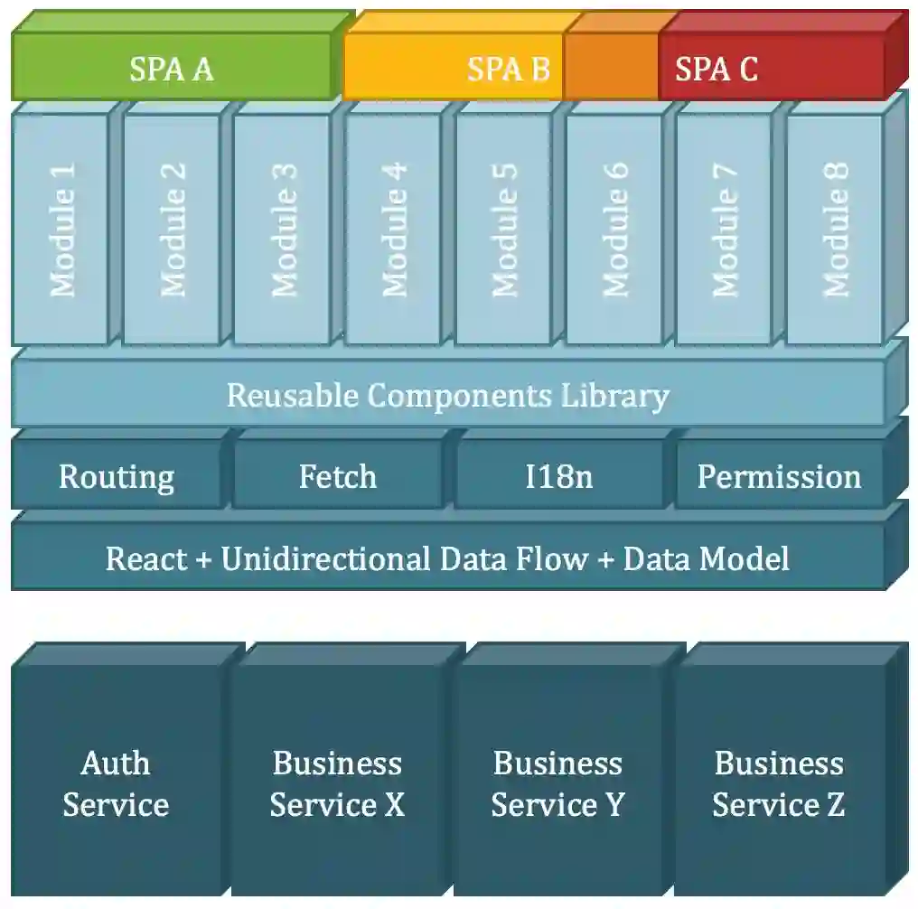 针对以上目标,我们选择 React 作为新前端核心技术,以 ES6 作为开发语言,利用 Webpack 和 Babel 进行编译打包。以 Mocha 全家桶加 Enzyme 作为单元测试框架保证组件质量。每个业务模块均开发、打包并发布为一个独立的 SPA(Single Page Application,单页应用),多个模块 SPA 之间,除了以统一的 SSO 服务保证用户认证外,并无更多的耦合,这一点保证了多个业务模块团队的工作不会互相制约。