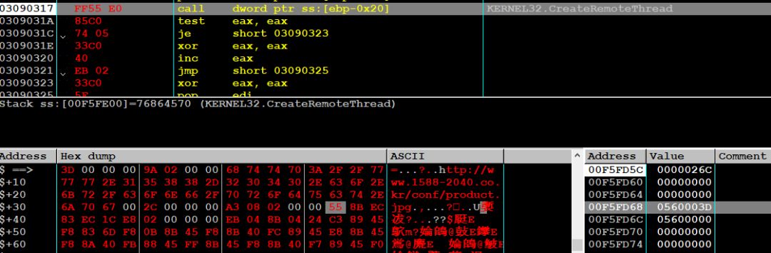 创建cmd进程,针对cmd进程通过远程线程注入代码的方式下载http://www.1588-2040.co.kr/conf/product.jpg所对应的恶意荷载执行。