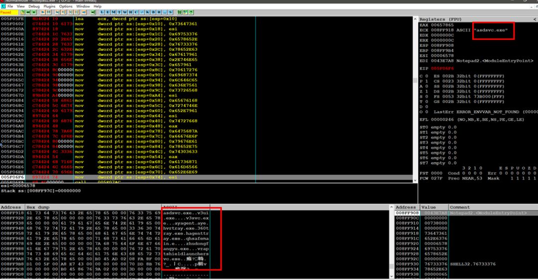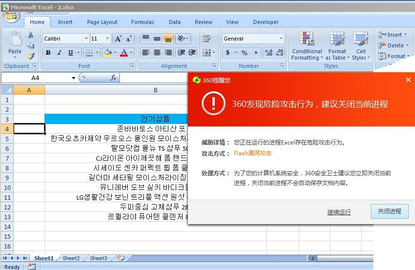接下来,漏洞触发执行的shellcode会通过进程名,判断用户是否安装了AhnLab、ViRobot APT Shield和360三款中韩常用的安全软件,以采取不同的方案进行攻击。