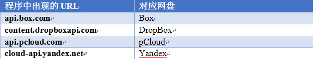 该后门程序使用公共云盘进行数据中转,程序中内置了4种云盘,分别是box,dropbox,pcloud, yandex,此次截获的样本使用的为pcloud网盘。