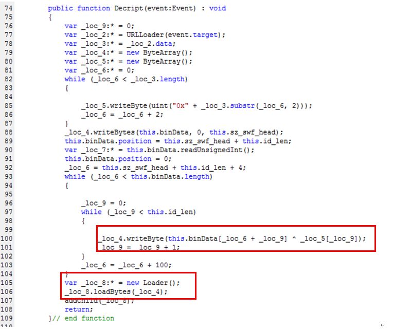 诱饵文档中的flash将解密远程URL地址返回的加密文件流,动态执行包含cve-2018-4878漏洞的flash内容。