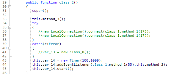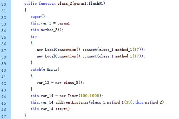 在class_2的构造函数中 LocalConnection().connect会主动调用gc释放没有的引用的内存,而第二次的LocalConnection().connect调用会产生异常,异常处理过程中又会new一个class_8的对象赋值给var_13。