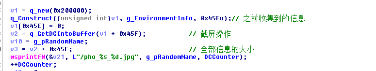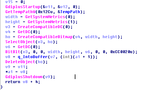 程序通过GDI API来实现截取受害机器屏幕的功能,并将图片保存在temp目录下,命名方式为随机产生的表示序号+当前截图的序号
