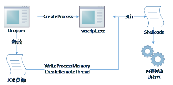 程序从资源中加载名为JOK的资源,资源的内容为实际执行的Shellcode,程序新启动wscript.exe,通过远程线程的方式将shellcode注入到wscript进程中执行,最终Shellcode会从内存中解密释放PE文件,自行加载节区重定位在内存中执行最终的后门程序。