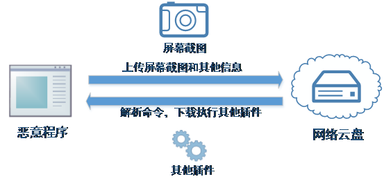 该程序使用公共网盘作为C&C服务器,用来存储截屏信息或者进行插件下载;相对于传统的CC服务器,使用公共网盘提高了流量识别的难度,因为网盘类网址均为可信的白域名。