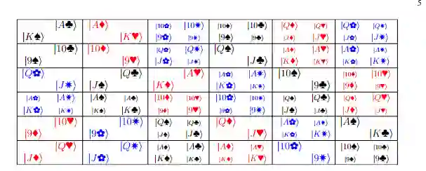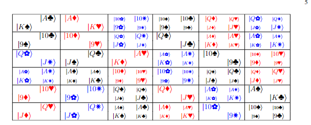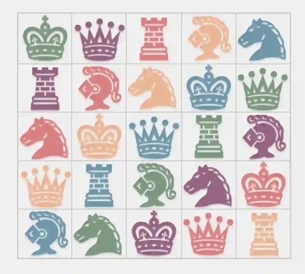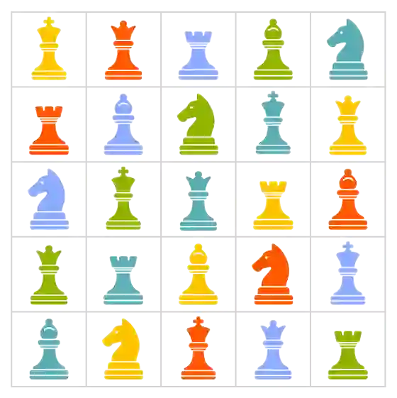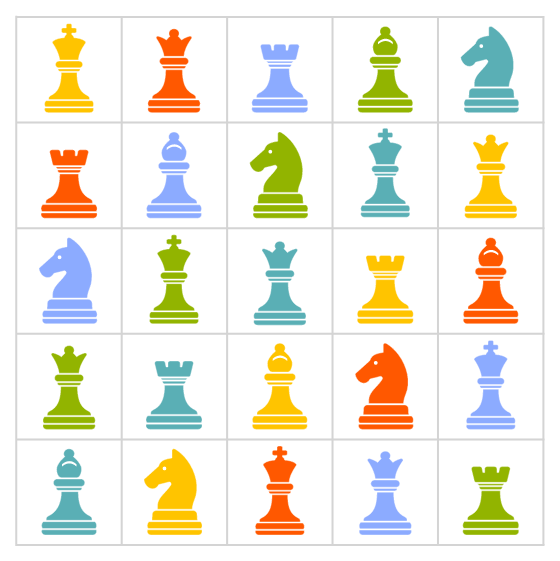 例如下图中就展示了一个5×5的方阵,可以用5种不同等级和5种不同颜色的棋子填充,且在同一行或同一列不会存在重复的等级或颜色。