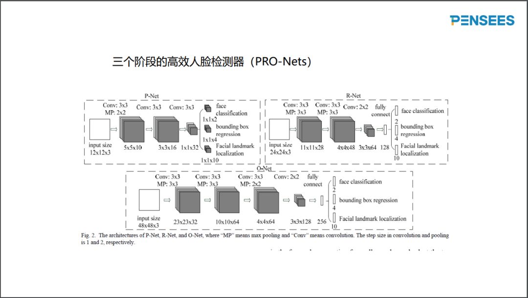 下面介绍一个基于ADABOOST思想的三个阶段人脸检测算法,如下图所示。总共有三个深度学习模型:PNET、RNET和ONET。PNET网络不深,只有三个卷积层,用12x12的窗口扫描图像金字塔,快速排除大量的简单负样本。留下的候选窗口用大小24x24重新抠,当作RNET的输入,RNET的计算量中等,有四个卷积层。对RNET可能没有成功排除的难负样本调用计算量比较大的ONET,输入大小为48x48,ONET有5个卷积层,构造最终的人脸/非人脸分类效果。同时ONET计算人脸5个特征点(眼睛,鼻尖,嘴角),用来在人脸比对之前做人脸矫正。