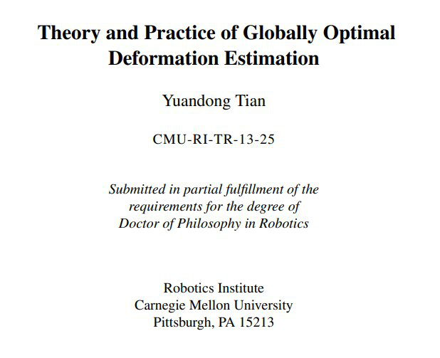 从零道一:从专业的层面来讲,你觉得博士期间遇到的最大的挑战是什么? 田:读博其实每个人都不太一样。有些人可能是老板规定太死,他没办法发挥。但对我来说,情况可能是倒过来的。老板在这方面其实懂的不多,所以最重要的是我能不能自主地找到一个方向并攻克它,这可能比跟着老板做要难多了。 我可能有一种倾向,就是做非常难的问题,有一种想要攻克难题的决心。但是,怎么把这个决心变成一个可实现的目标是一个很困难的问题。 我在知乎的一篇文章(《博士五年之后五年的总结》)中也写过,这五年我学会的最重要的事情是怎么把一件事分成几部分来做,这样才能开始做比较大的事情。刚开始的时候,我觉得我想把很难的问题解决掉,别人都解决不了我去解决。 作为一个刚来的博士生,想要攻很难的问题,心气是很高的,但怎么落地是一个很难的问题。你可能会花很多时间去思考,而且这个思考是漫无边际的。今天想这个,明天想那个,非常地不连贯,非常天马行空,你自己觉得好像是在做研究,但其实是在浪费时间。因为思路没有落地的结果就是不能存盘,下一次你还要从头开始想。而且,它无法形成一个持续的步骤,这样对自信的打击也是很大的。比如说你可能思考了很长时间,然后发现:哎呀,不是很有效果,怎么办呢? 经过了博士阶段的几年之后,你才会知道自己先要去想什么,再去想什么;什么能做,什么不能做;什么是自己力所能及的;什么是别人已经做过的,什么别人还没做,还有机会。这种对于学术的感觉也是通过博士这五年慢慢练出来的。 田渊栋博士论文:《Theory and Practice of Globally Optimal Deformation Estimation》