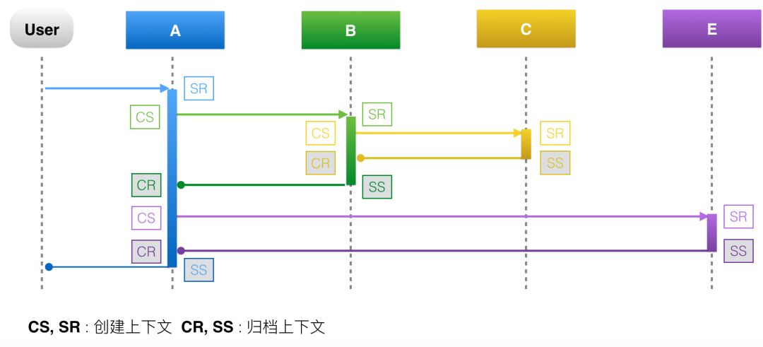 CR(Client Recieve)阶段 : 客户端接收返回结果,这个阶段会将客户端上下文数据上报,上报的数据有:traceid=123456,spanId=0.1,appKey=A,method=B.method,start=103,duration=38。