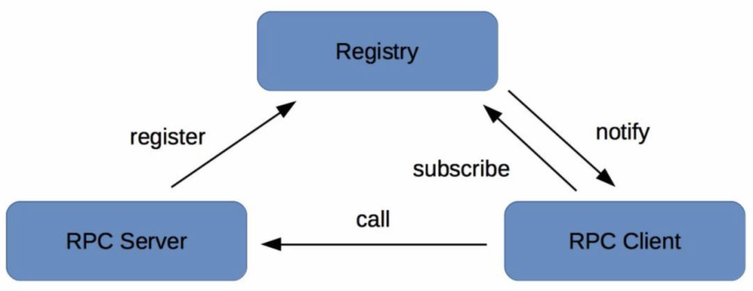 在微服务架构下, 主要有三种角色:服务提供者(RPC Server)、服务消费者(RPC Client)和服务注册中心(Registry),三者的交互关系如图