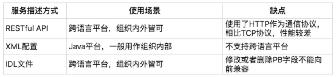 具体采用哪种服务描述方式是根据实际情况决定,通常情况下, 如果只是企业内部之间的服务调用,并且都是 Java 语言的话,选择 XML 配置方式是最简单的。如果企业内部存在多个服务,并且服务采用的是不同语言平台,建议使用 IDL 文件方式进行描述服务。如果还存在对外开放服务调用的情形的话,使用 RESTful API 方式则更加通用。