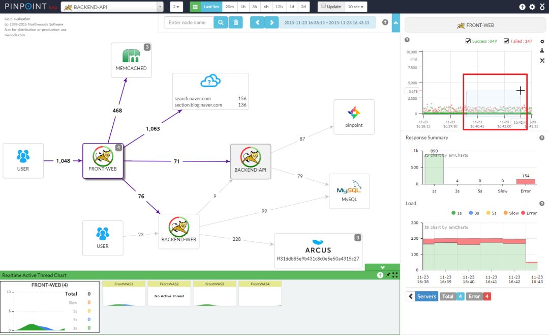 调用拓扑图是一种全局视野,在实际项目中,主要用作全局监控,用户发现系统异常的点,从而快速做出决策。比如,某一个服务突然出现异常,那么在调用链路拓扑图中可以看出对这个服务的调用耗时都变高了,可以用红色的图样标出来,用作监控报警。