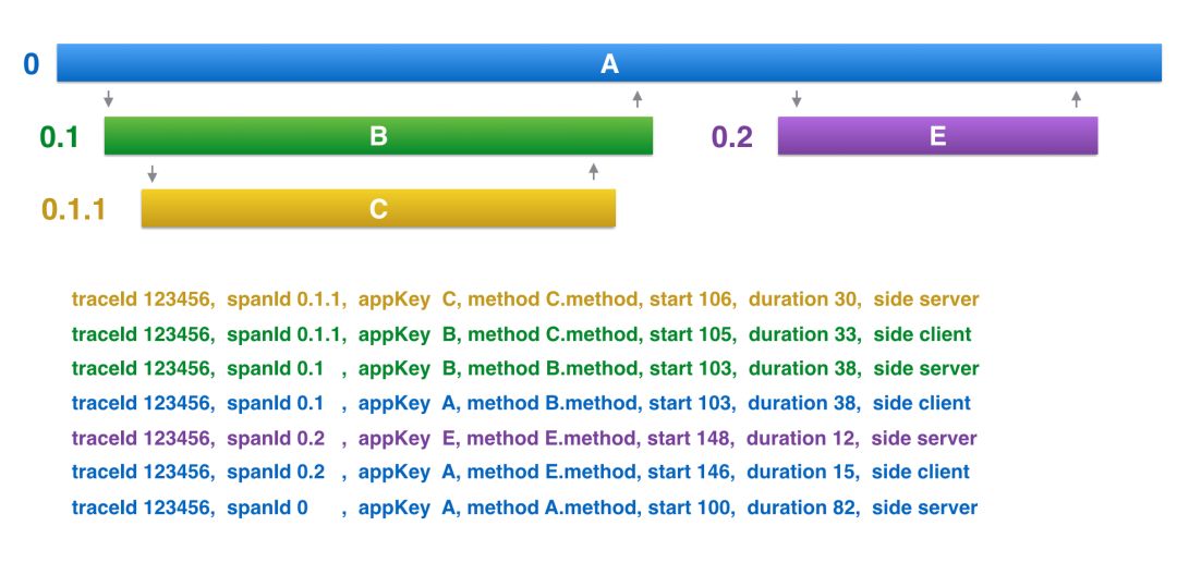 SS(Server Send)阶段 : 服务端返回请求,这个阶段会将服务端上下文数据上报,下面这张图可以说明上报的数据有:traceId=123456,spanId=0.1,appKey=B,method=B.method,start=103,duration=38.