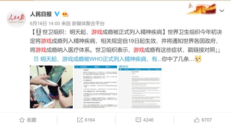 6 月 18 日,《环球时报》旗下环球网引用台湾媒体消息,称世界卫生组织 (WHO) 今年初决定将游戏成瘾列入精神疾病,「相关规定将自 19 日起生效,WHO 将通知世界各国政府,将游戏成瘾纳入医疗体系」,相关报道一经刊发随即引发国内媒体大量转载,就连《人民日报》官方微博也以《世卫组织:明天起,游戏成瘾被正式列入精神疾病》为题进行了转发。