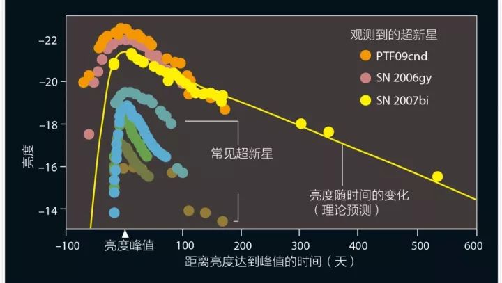 惊人的亮度:过去几年中,本文作者及其合作者观测到的一些超新星爆炸,被证明是科学家当时观测到的最剧烈的爆炸。2006年,他们观测到了一个亮度破历史记录的超新星(粉色),2009年又观测到了更亮的超新星(橙色),但这些超新星暗去的速度相对较快。2007年,他们观测到的另一颗超新星虽然在亮度上不是最高的,但它释放的能量却是最多的(黄色)。科学家认为,这类新的超新星爆炸发生在质量非常大的恒星中。