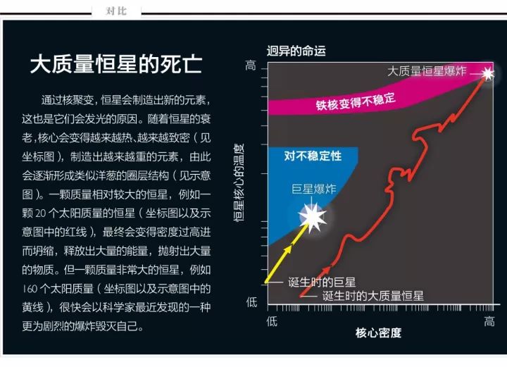 恒星发光是因为它们的核心极为致密,温度极高,能使得氢原子聚变成氦以及更重的元素,释放出能量。密度和温度这两个参数,大体上控制着一颗大质量恒星核心的物理状况及其演化。通常,随着时间流逝,恒星的核心会变得越来越致密,温度越来越高,反应条件会越过一个又一个阈值,使核心里的物质聚变成越来越重的元素——首先是从氦到碳,然后是从碳到氧……每个反应阶段可能会持续数千到数十亿年,具体时间则取决于恒星核心的燃烧对温度和压强的影响有多大。