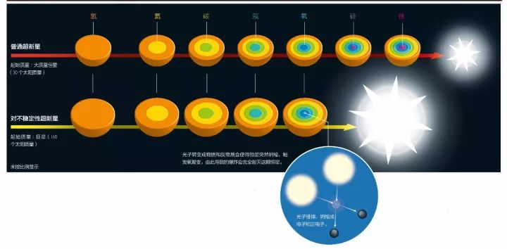 拉卡维及其合作者计算了一下,当一颗质量数百倍于太阳的恒星经过演化,其核心的绝大部分都由氧构成时会发生什么。在较小的恒星中,我们知道接下来会发生什么:这颗恒星会收缩,核心会升温,直到条件允许,氧聚变成硅为止。但在一颗特超巨星(hypergiant)中,该理论认为,恒星核心会在引力作用下收缩,温度也会升高,但密度不会变得太大。因此在这种情况下,不会发生氧的聚变,而是会有其他事情发生:物理学家称之为对生成(pair production)。