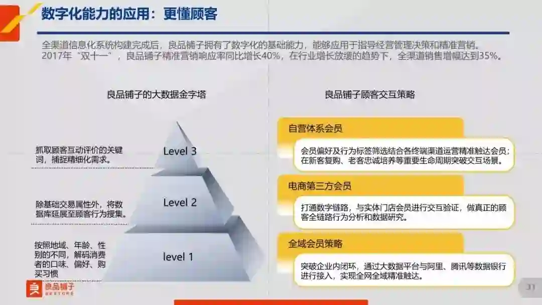 用户体验和效率如何提升?我们要把顾客变成忠实的会员,并使他们持续复购,这需要数字化的运营能力。于是我们在数字化的大金字塔上搭建了3层结构。