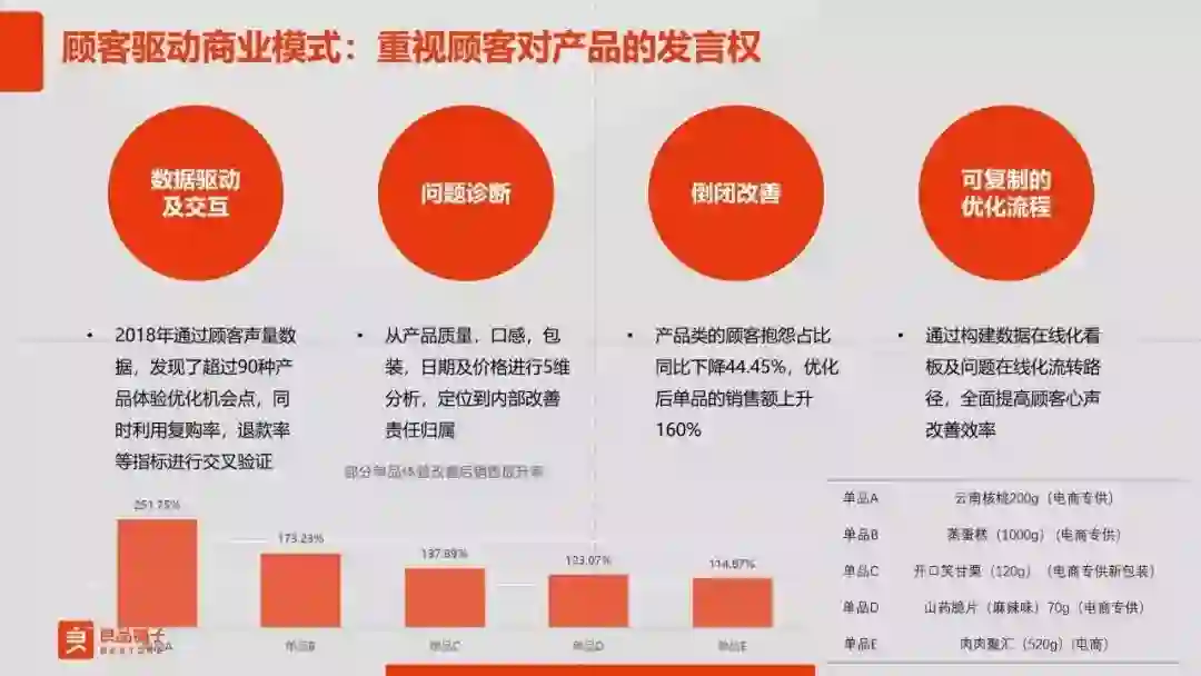 这也倒逼我们在产品研发上进行改善。通过这种改善,去年产品类的顾客抱怨比上一年占比下降了44%,并且根据这个方式优化后的所有单品销量都很不错。