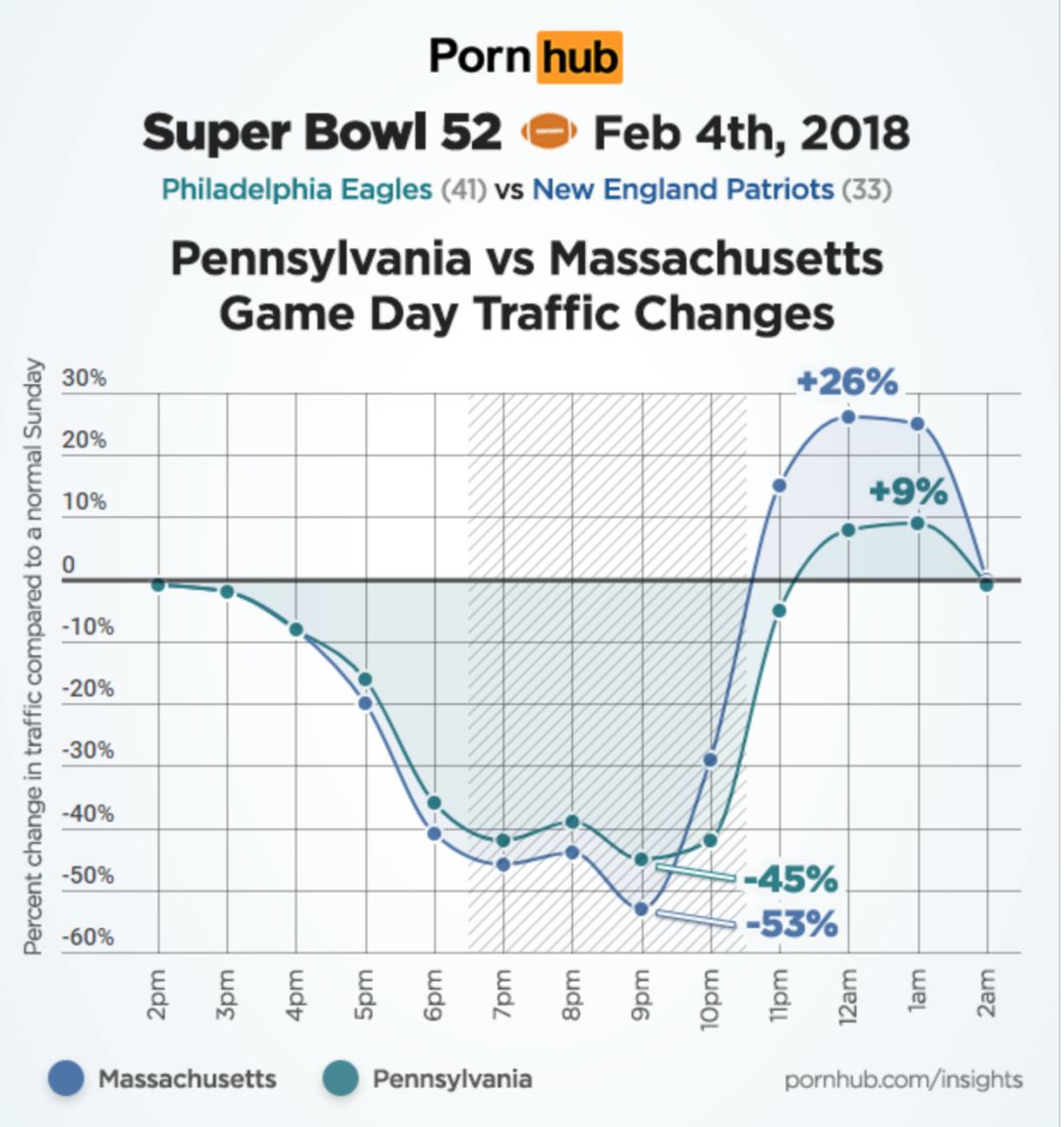 (图为18年超级碗期间,pornhub的男女流量占比变化)