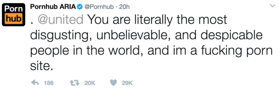 另外,对于社会事件,Pornhub也是很有态度的。在17年4月9日美联航强行拖华裔乘客下机事件发生后,pornhub官微对美联航破口大骂:“你tmd连老子一个色情网站都不如。”