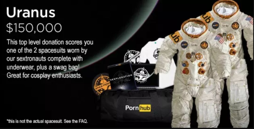 举一个小例子,下图为Pornhub在站内举行的一个叫做 Sexploration(性+探索)的众筹活动,打算筹集 340 万美元,将两位“宇航员” Eva Lovia 和 Johnny Sins 送上太空,拍一部在太空中的OOXX影片……