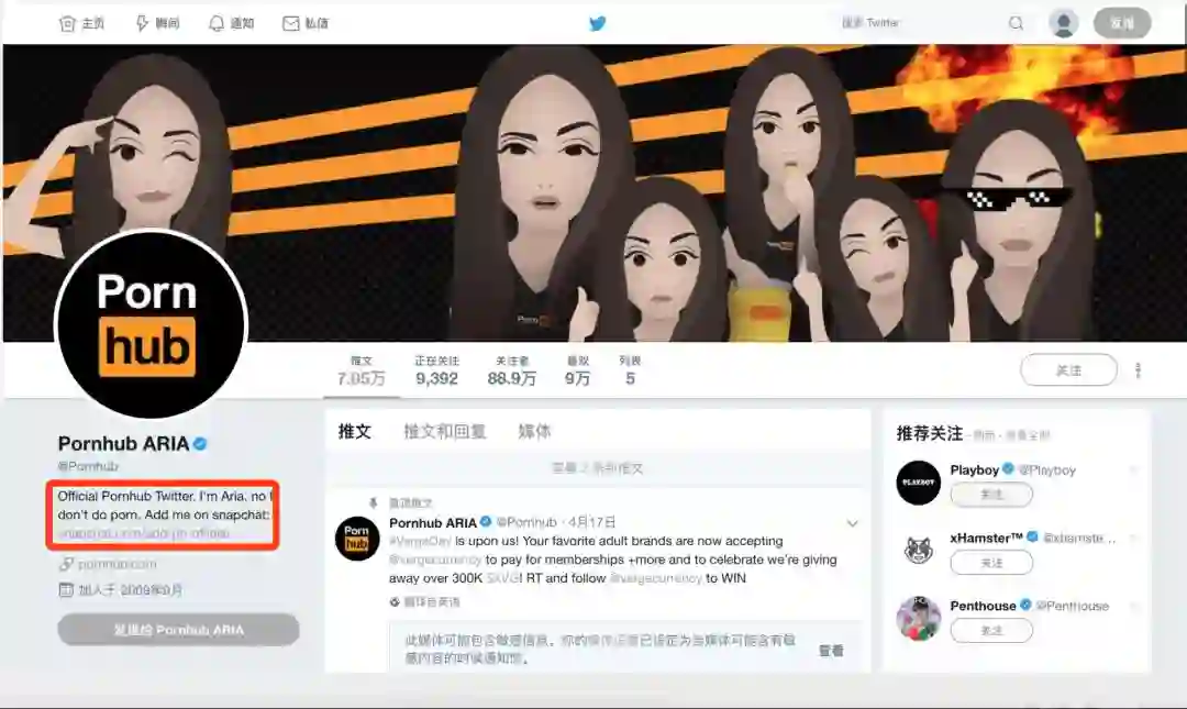 Pornhub产品和技术很厉害,但运营水平一点都不差。现在被我国企业广为推崇的人格化社交媒体,Pornhub老早就玩起来了,其官方twitter是个叫「aria」的妹子。这个人设吸引了很多人的关注,因为“她”不仅给你推荐视频,还会带你一起看电影……(此处同样省略细节描述1万字)