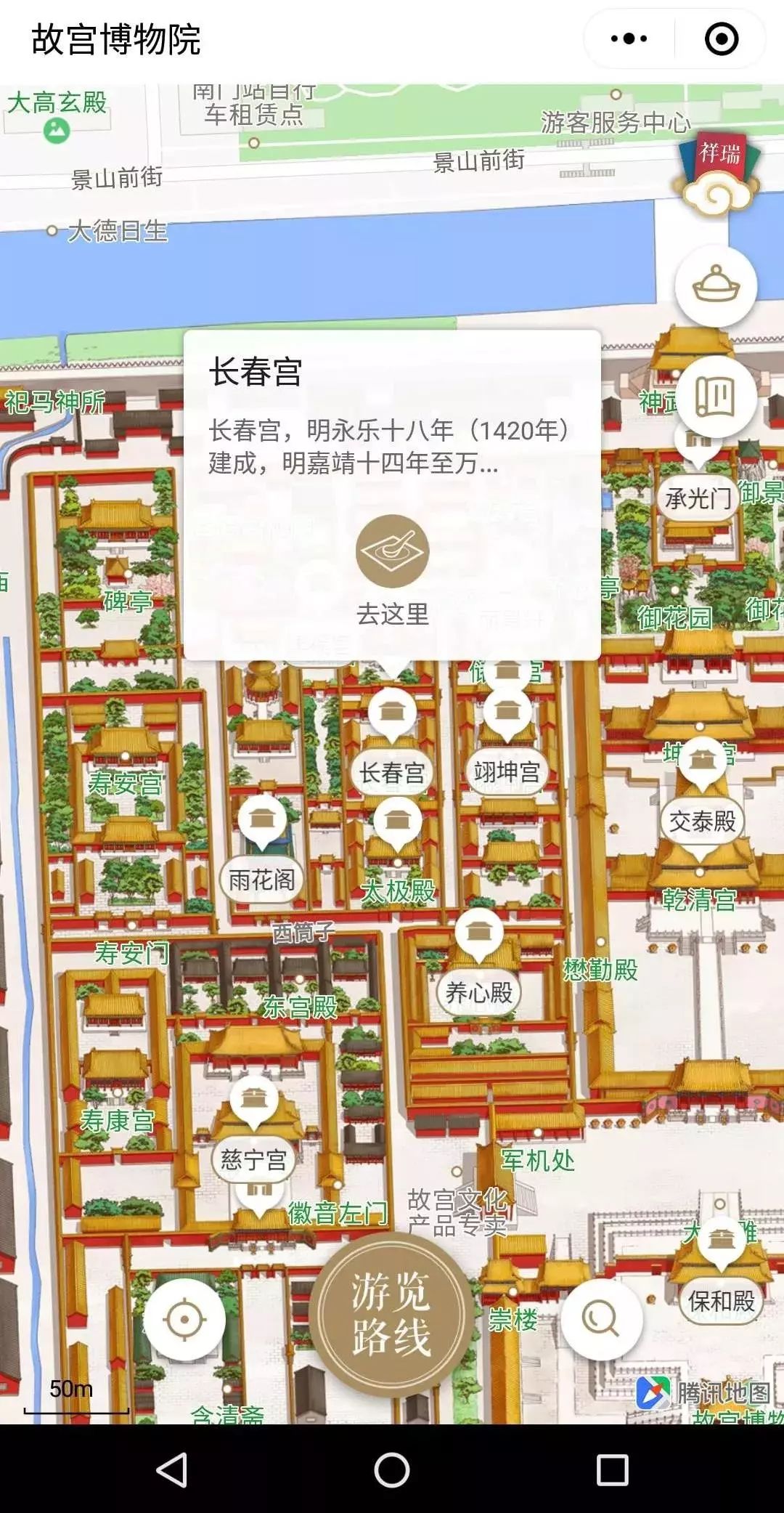 依托VR技术,故宫将紫禁城中的养心殿“搬进”了展览,观众戴上VR设备便能置身其中,还可以体验批奏折、盖宝玺的乐趣,触感手套还能使人切实感知纹理细节,打破“只可远观不可亵玩”的惯例,优化观展体验。“玩转故宫”小程序基于腾讯LBS技术,生动展示故宫全貌,为游客提供博物馆概况、位置查找、路线规划等在场的长效导览服务。