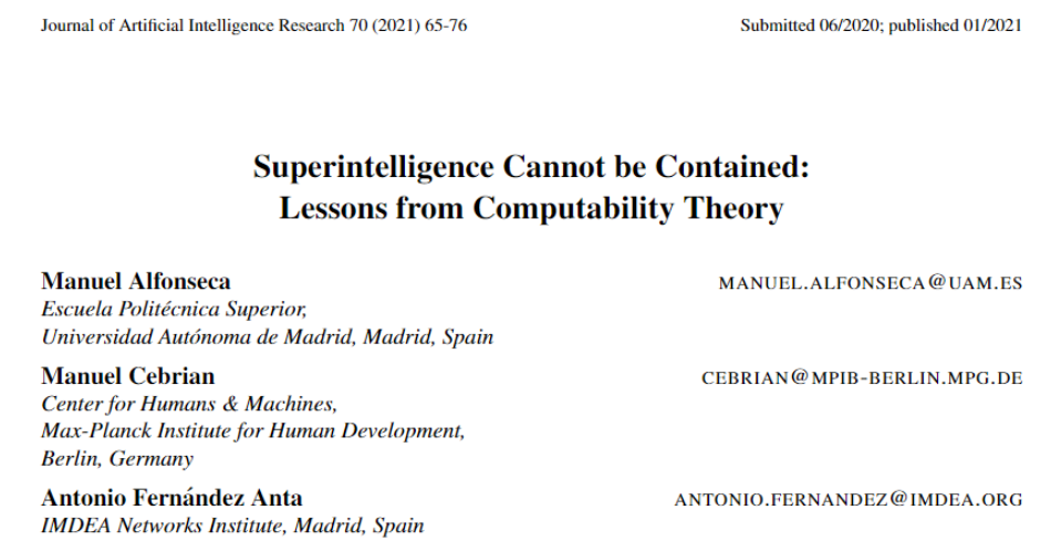 最后,Alfonseca 说道:「我们还没有证明超级人工智能永远无法控制,我只是说它们不能被永远控制。」