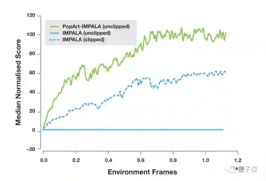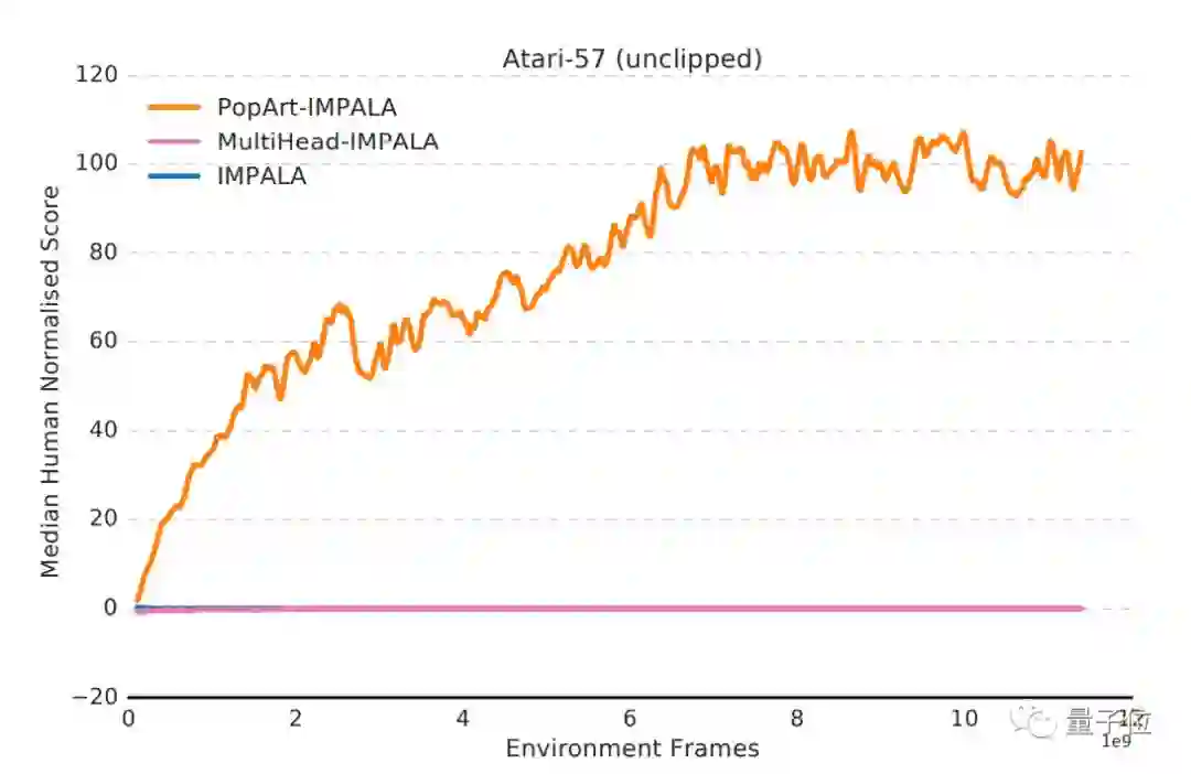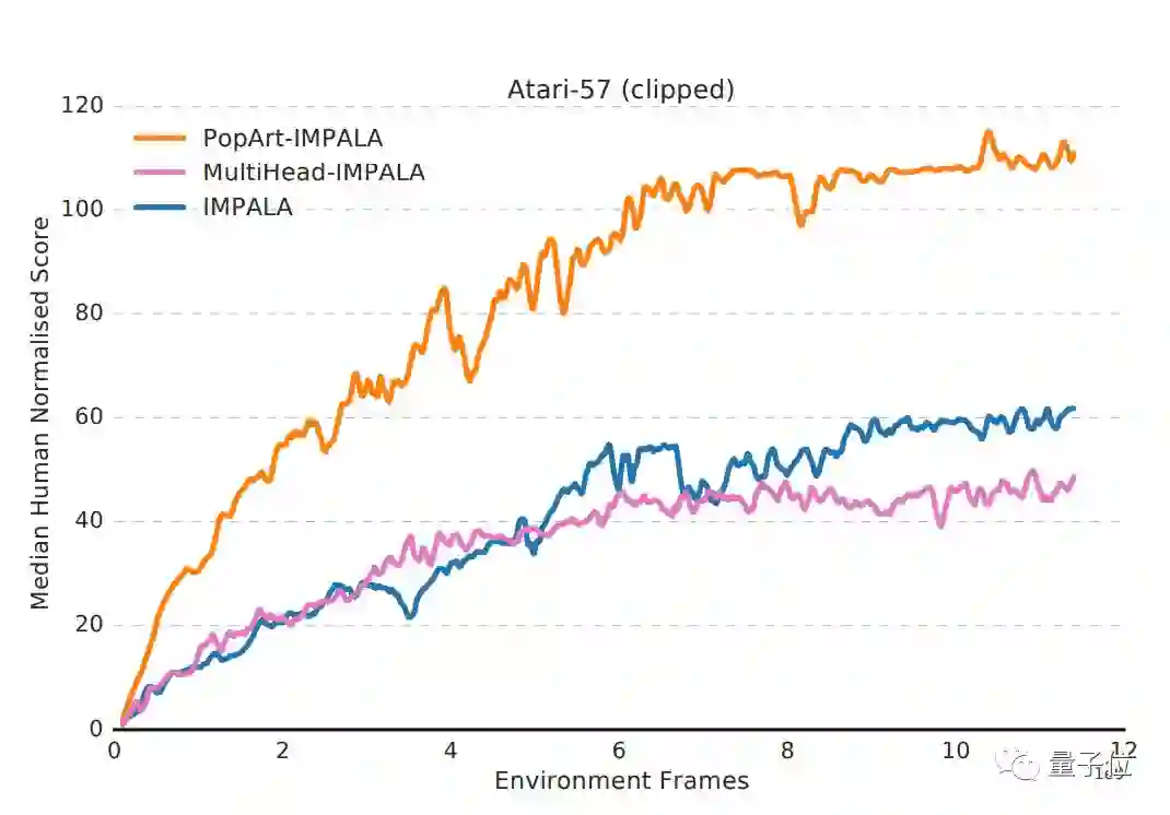 最后,研究人员将PopArt应用于Importance-weighted Actor-Learner Architecture (IMPALA)中,这是DeepMind此前提出的、最常用的深度强化学习智能体。