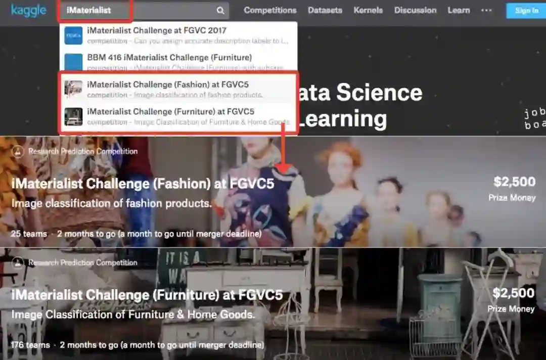 进入 Kaggle 官方网站后,在搜索引擎上输入 iMaterialist,选择【iMaterialist Challenge (Furniture) at FGVC5】或【iMaterialist Challenge (Fashion) at FGVC】,登录帐号后即可参赛。